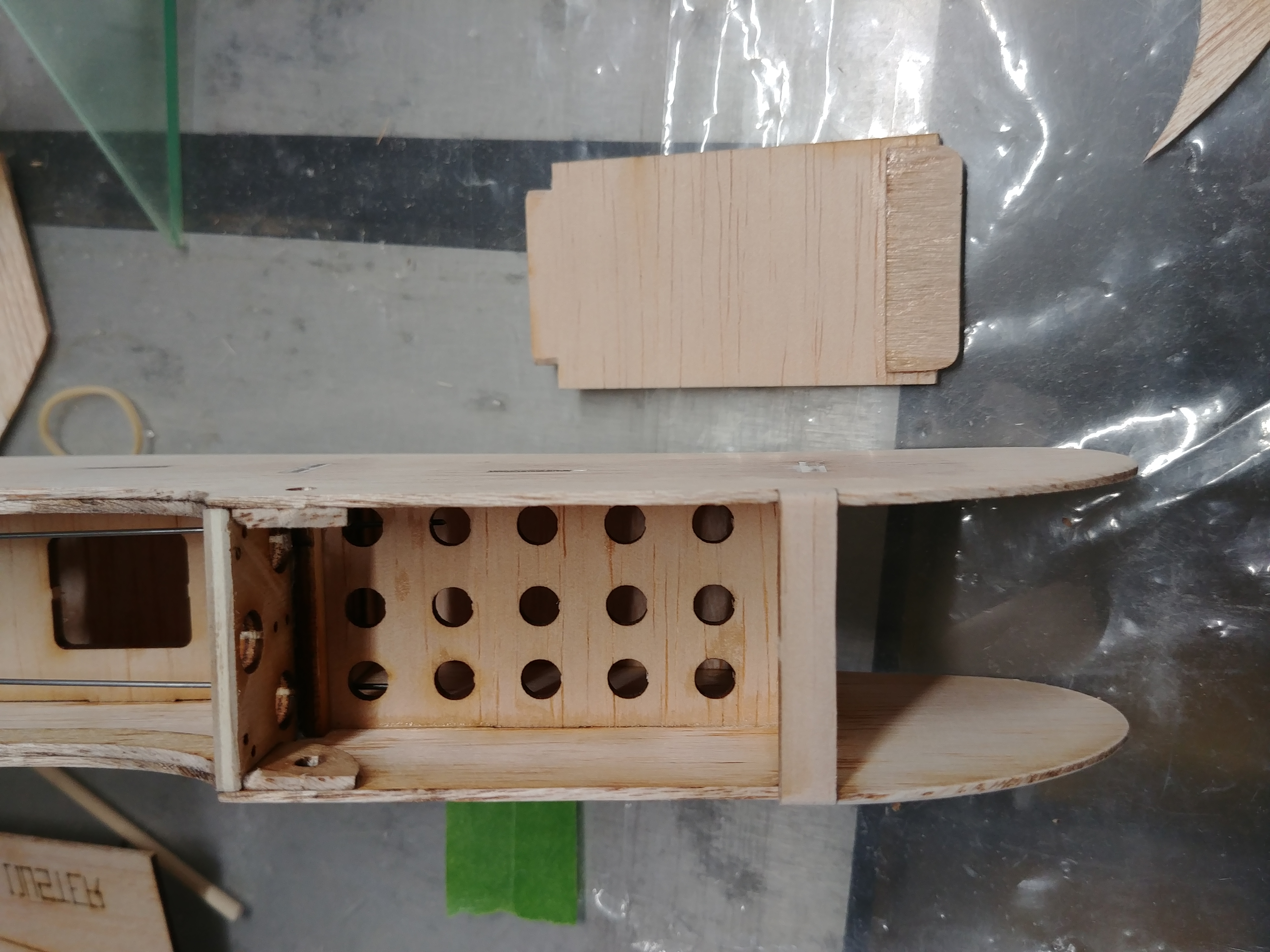 Before I glue in the last former in the tail I pinch the fuselage halves together and tape them. Then measure the fuselage width and hold the fuselage against a straight edge and make sure the seam at the tail is centered.