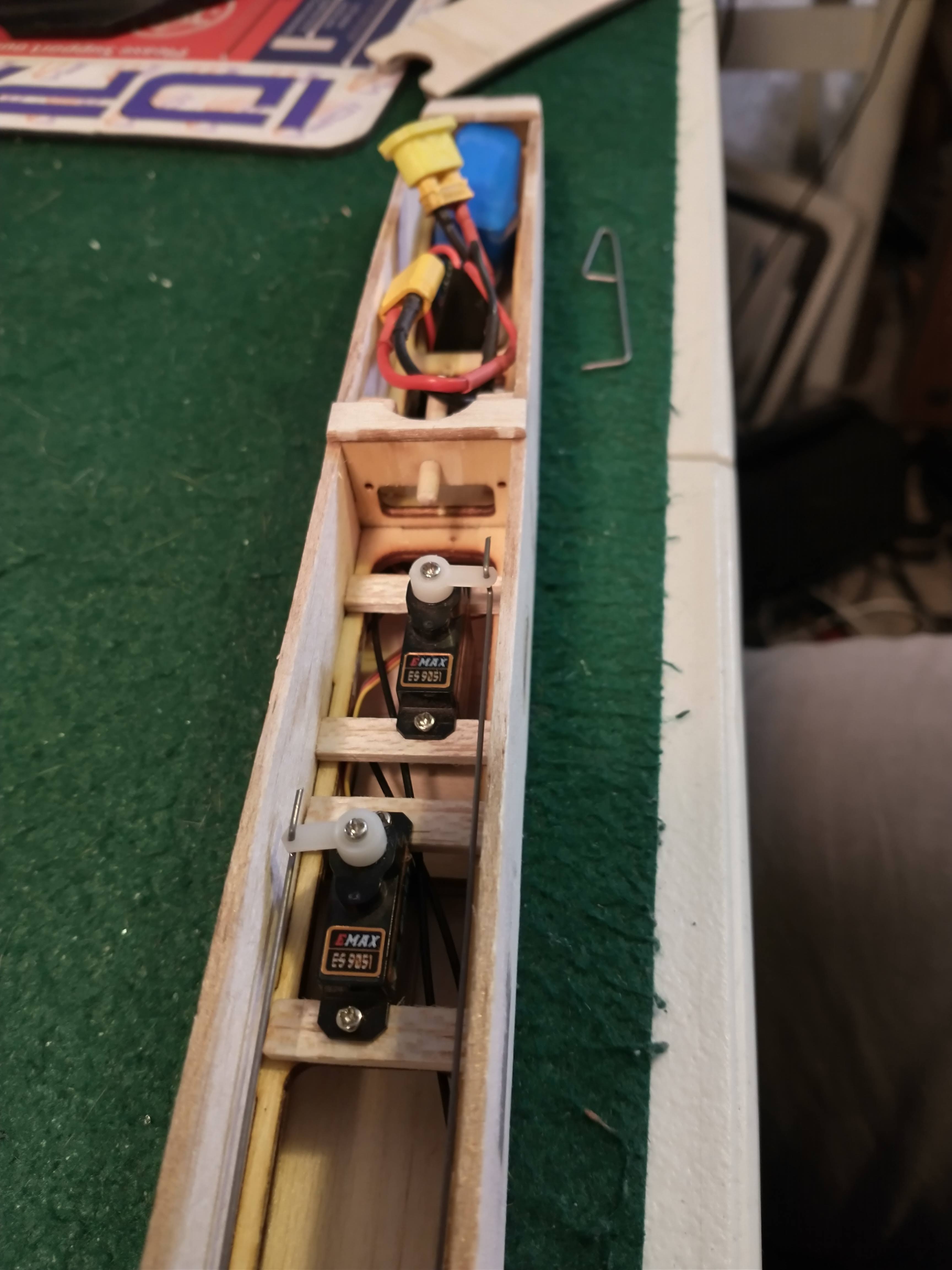 Before moving on to gluing the top sheeting in place, I wanted to install the servos and get the control rods run thru the formers.