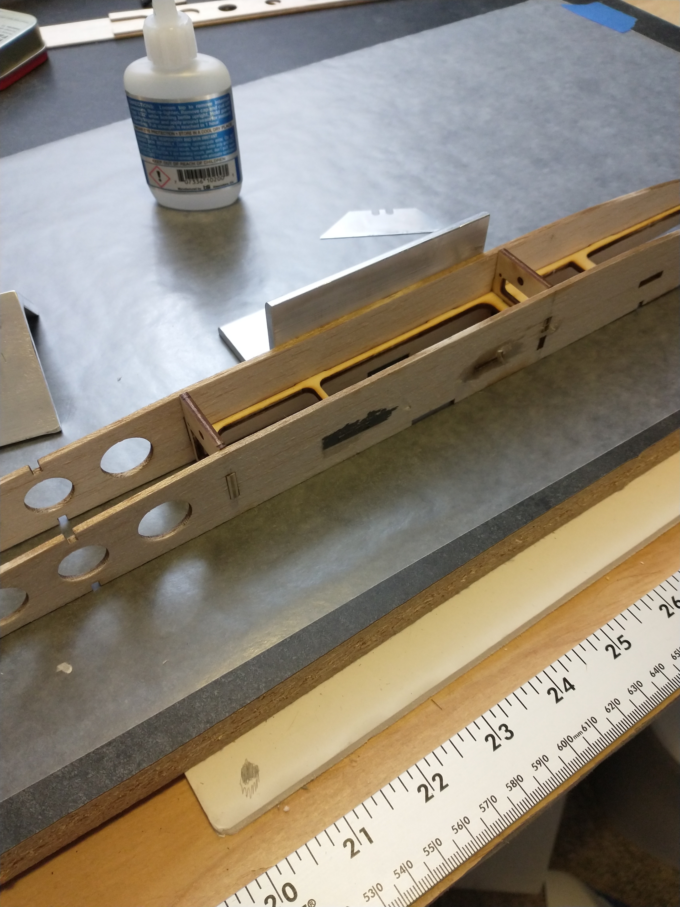 Once everything was in place, I began pouring the CA... and promptly glued my fuselage to one of the angles... It took some very careful and slow blade work with a long snap utility blade to get it free. Thankfully, I was able to do so with minimal damage to the side of the fuselage. Nothing a little sanding won't fix. Not to future self, apply a couple "tack welds" of glue in key points to hold things together, then remove your supports and finish gluing. Also, don't over apply the glue. That stuff RUNS!!