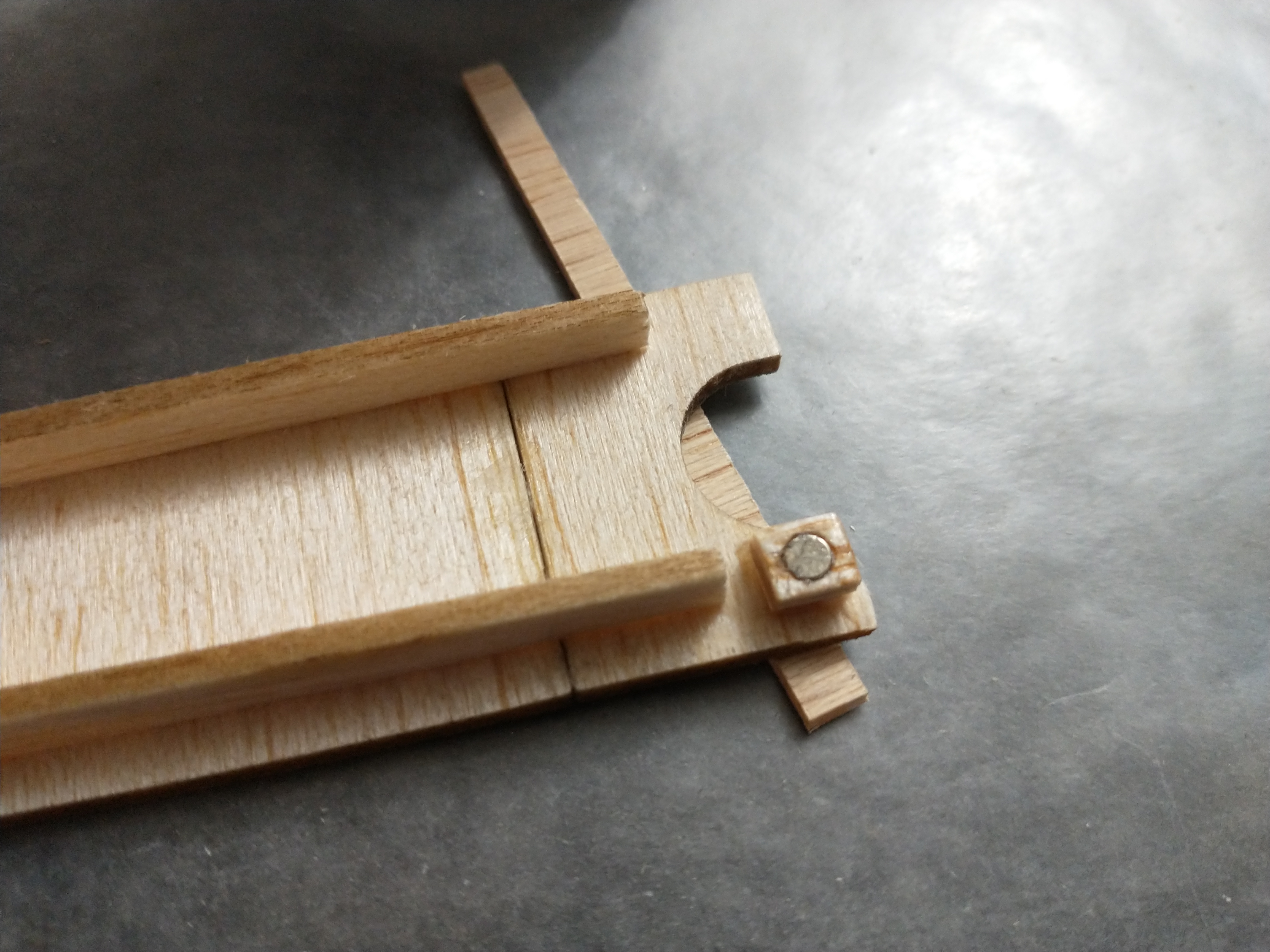 Using a bit of wax paper to protect from glue in the wrong spot, I took the mating magnet and balsa square, placed them on top, added a drop of thin CA and put the battery hatch in place. Thus gluing the battery hatch to the top magnet block. This worked surprisingly well, and now my magnets are lined up perfectly.