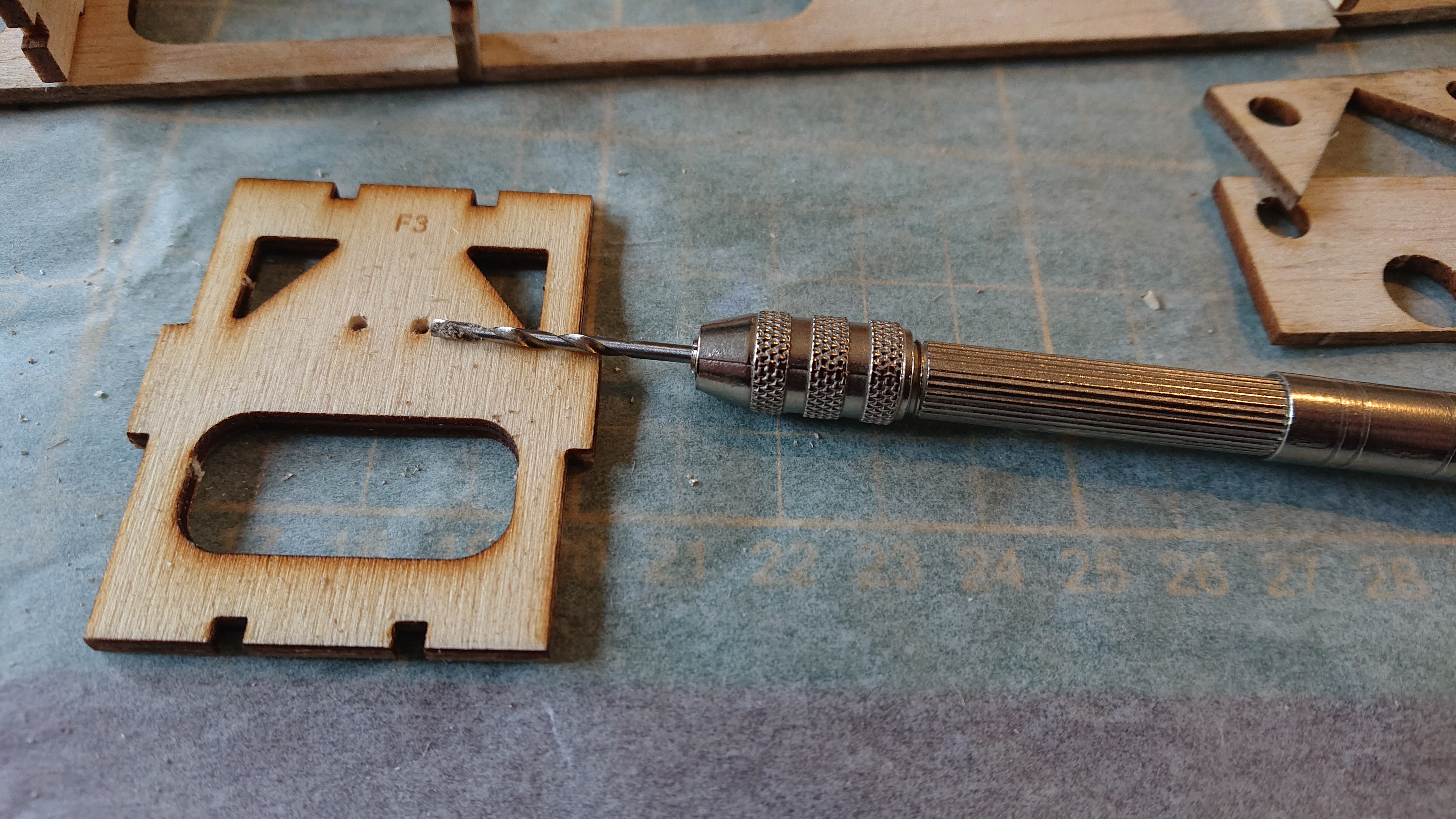 Before doing so I made the holes (for the pushrods?) a bit bigger. They were quite small and when removing the lasered out bit there was some uneven wood, so I decided to make the hole bigger. just in case they might be needed later on.