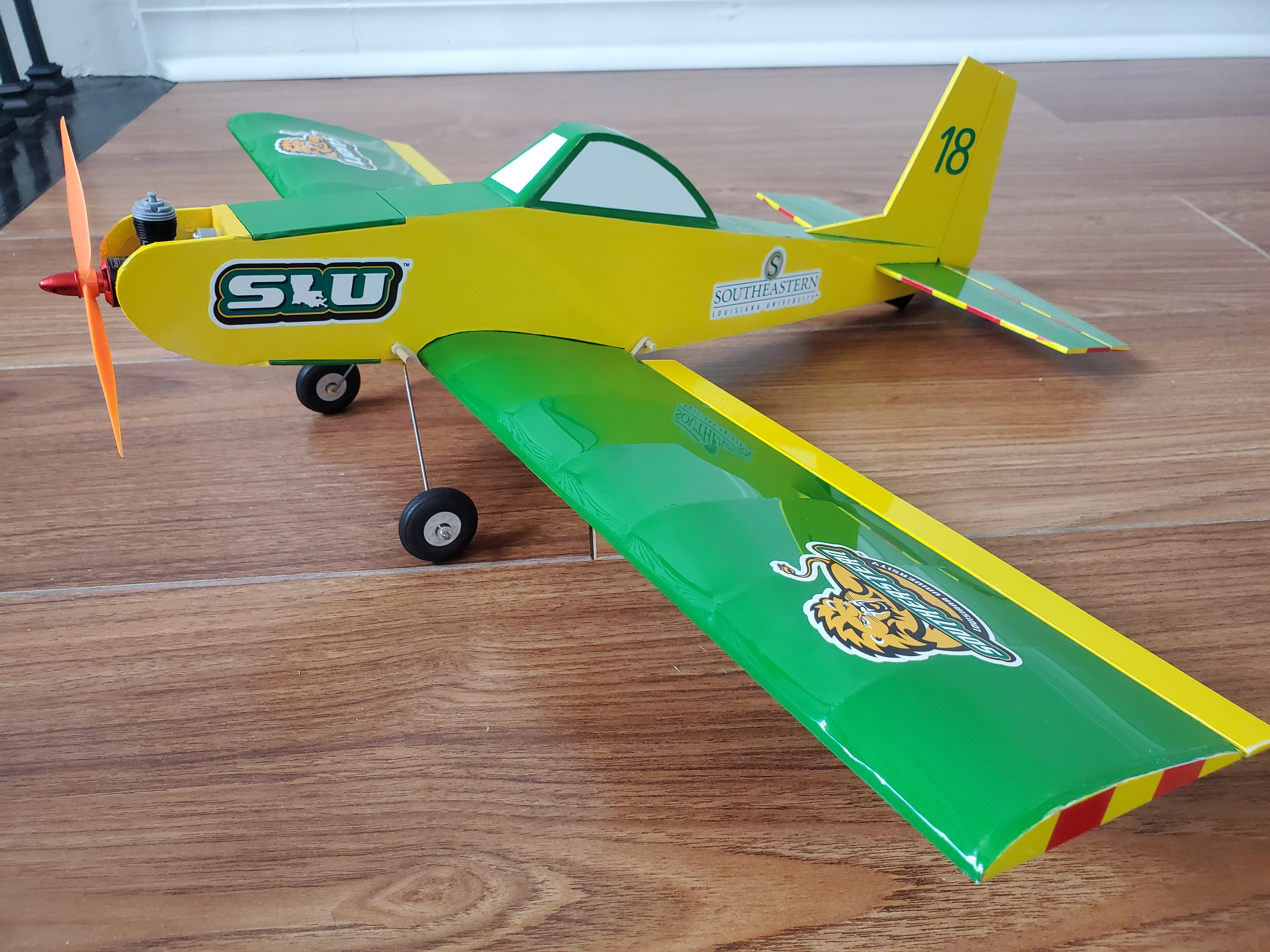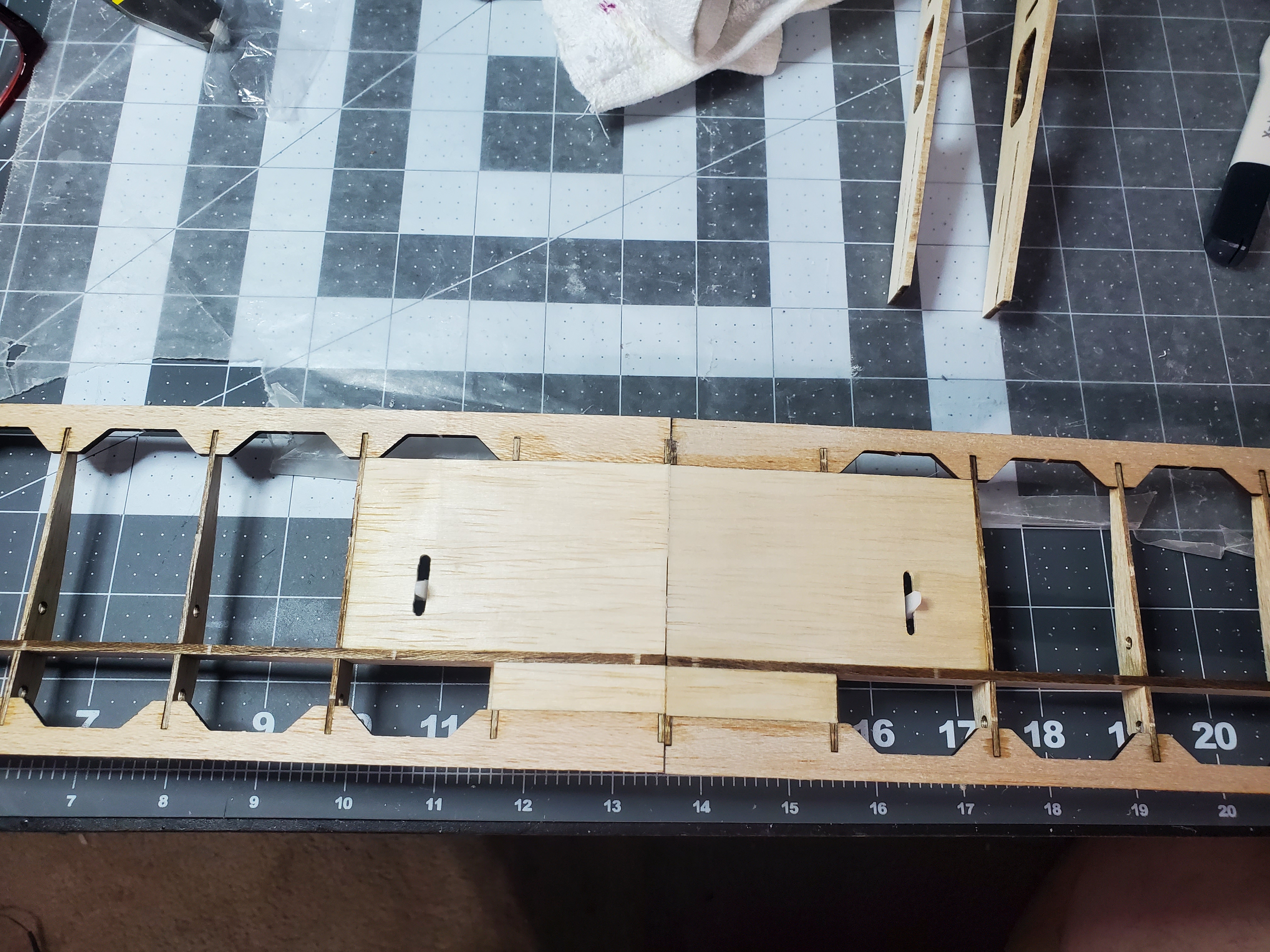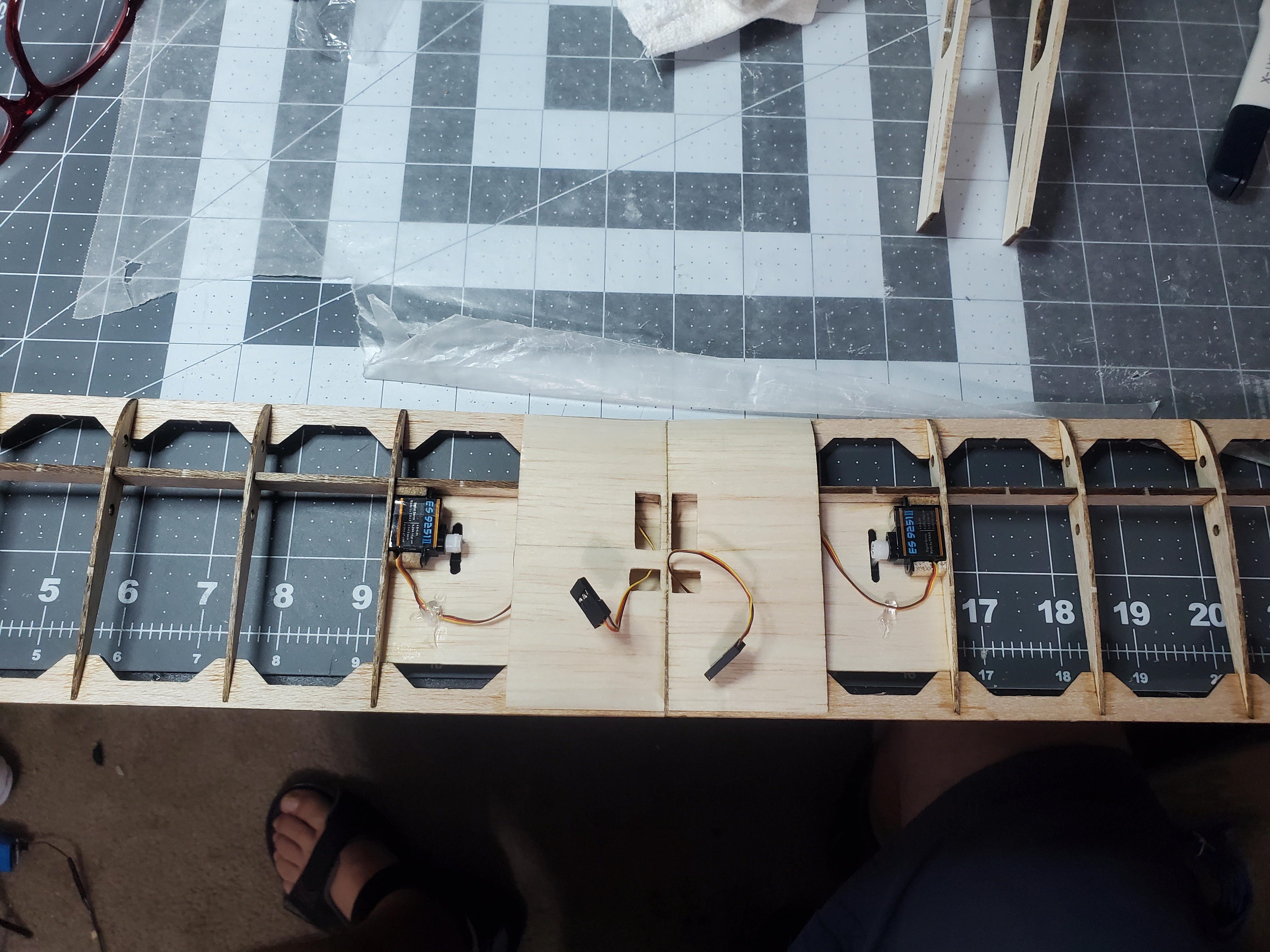 Therefore, I opted for the typical one-servo-per-wing-half method. I crafted a new bottom sheet, extending to cover a second rib, to make a place for the servo. The pictures should, in theory, make it self explanatory. Let me know if you have any questions. It will be a few weeks before I can maiden the plane as I am in the middle of cataract surgery. Doing the fishing line hinges on the ailerons with only one currently-usable eye was challenging...