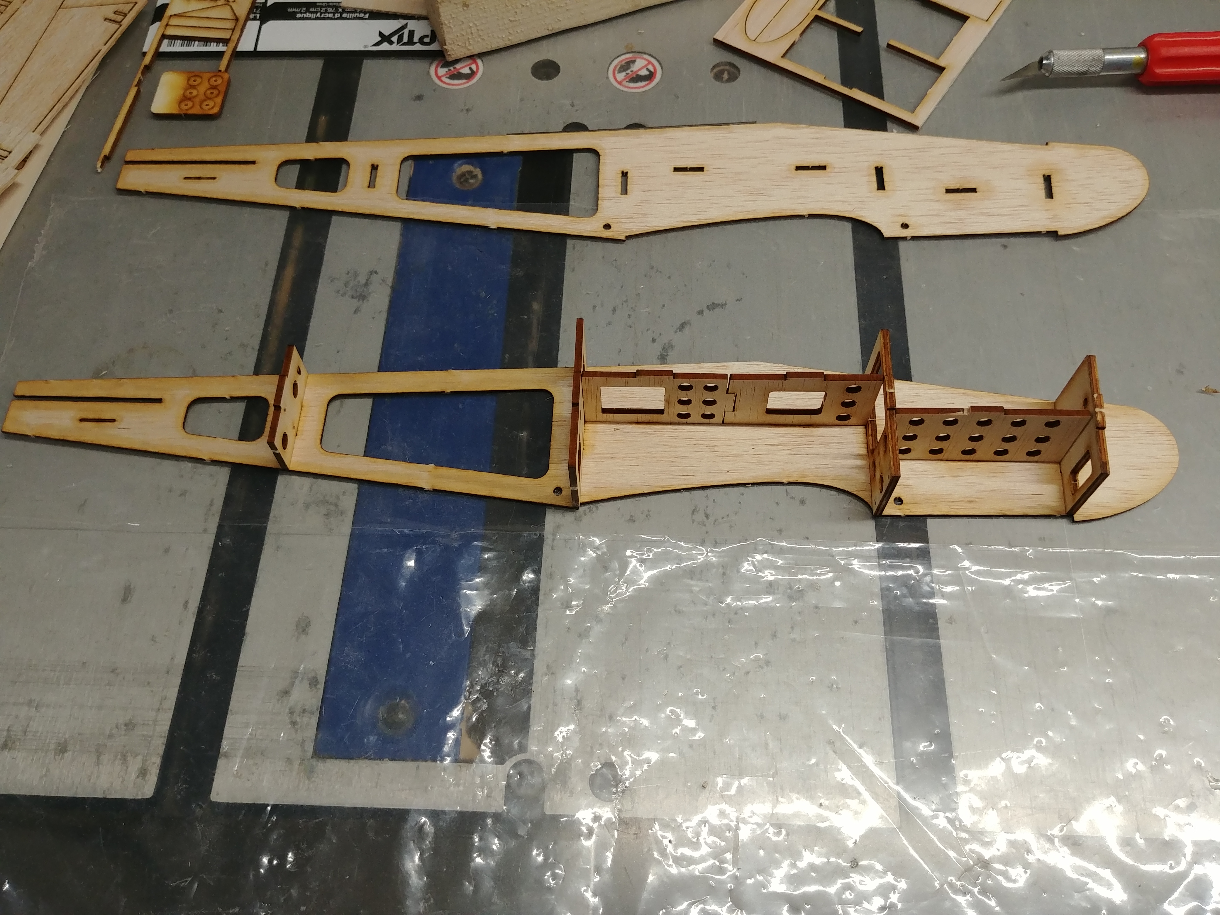 Before I glue in the last former in the tail I pinch the fuselage halves together and tape them. Then measure the fuselage width and hold the fuselage against a straight edge and make sure the seam at the tail is centered.