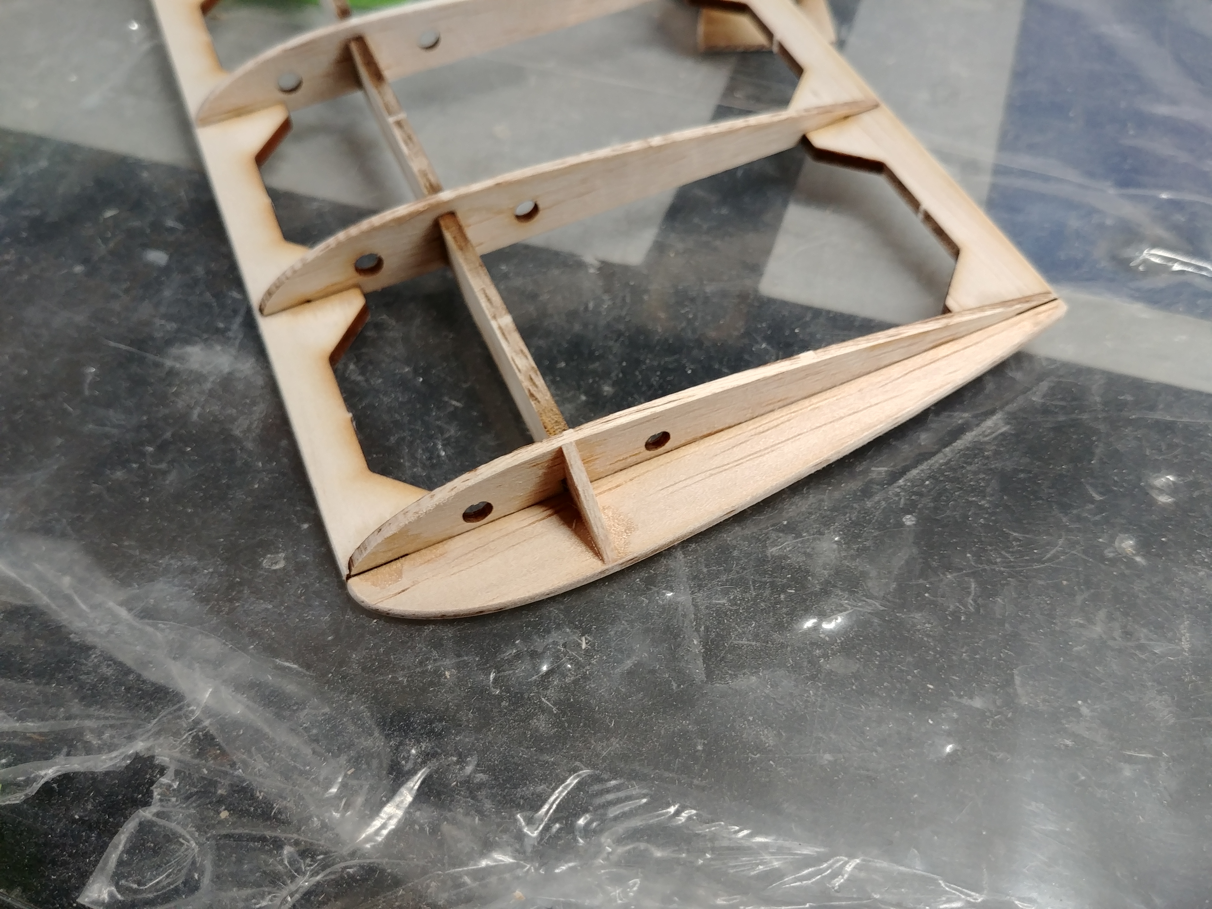 The kit comes with 4 wing caps so you can glue 2 on each wing tip and sand a radius on them. I decided to use one on each side glued flat and then cut a little wedge from scraps to reinforce it.