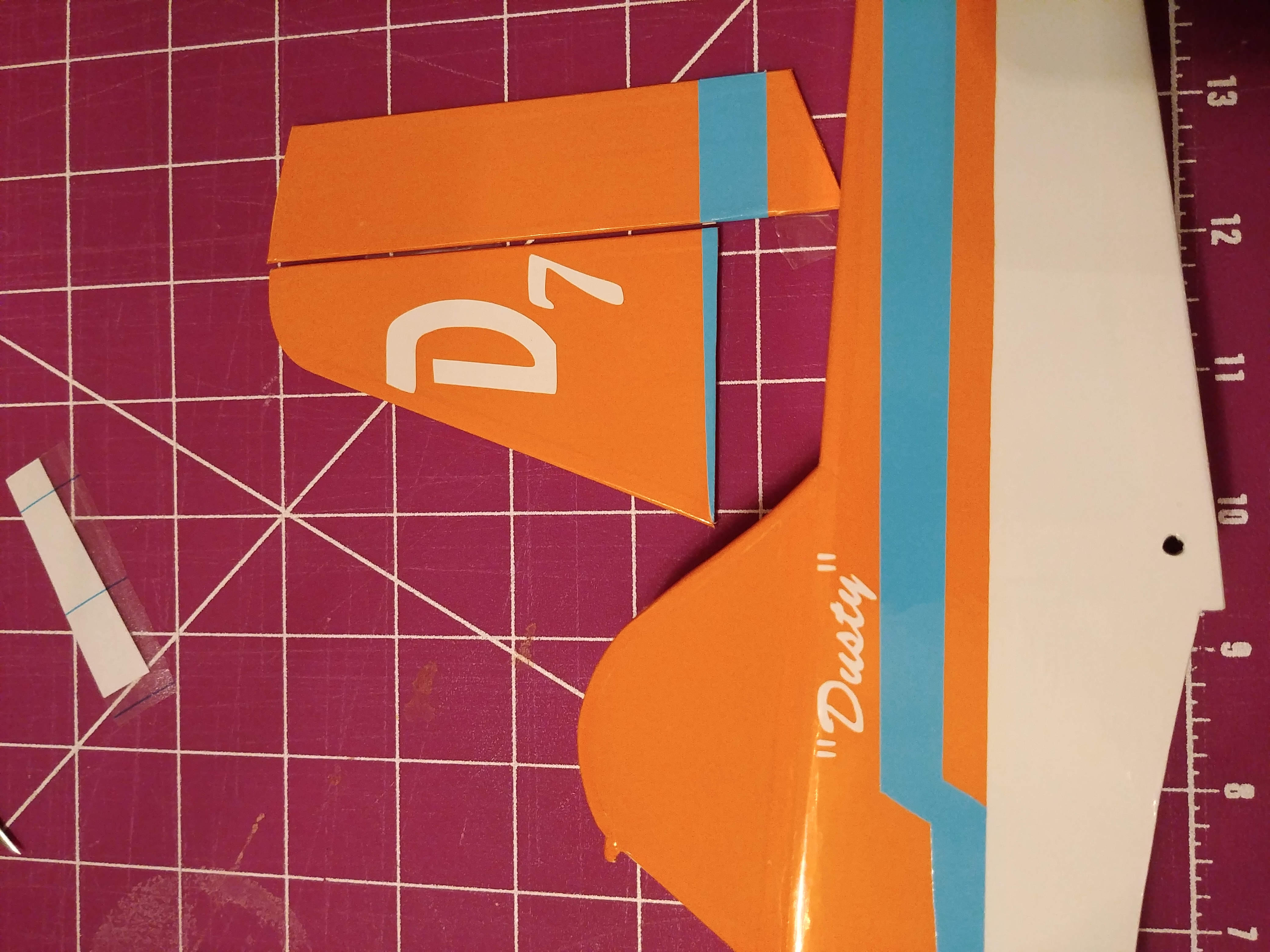 Dusty's tail surfaces are shaped a little different than the crop duster kit so I used more scraps to try and make them resemble the cartoon. I squared up the rudder and elevator then cut more of an angle on the vertical stabilizer. Once I had them built up I trimmed and sanded them to shape ...