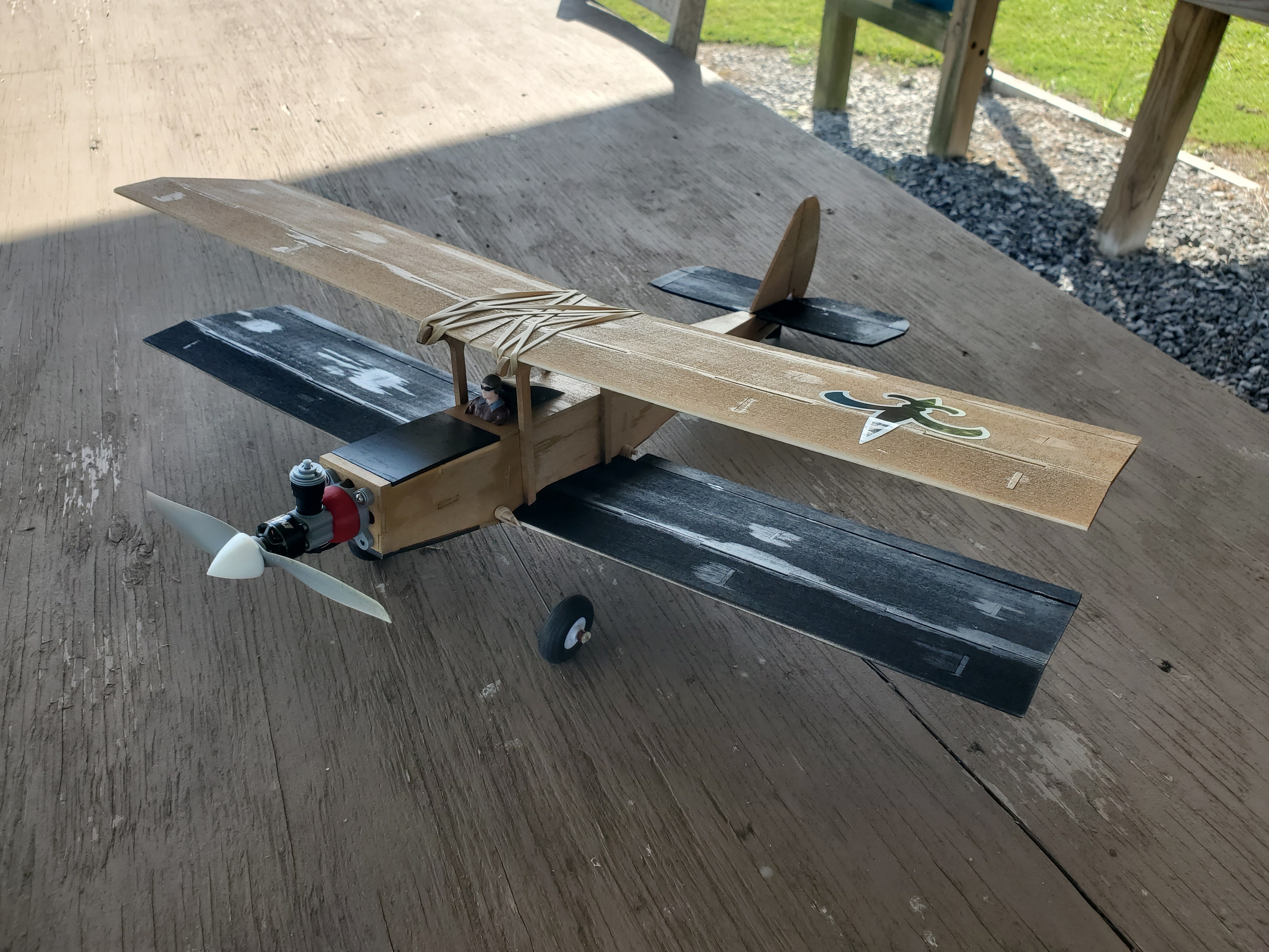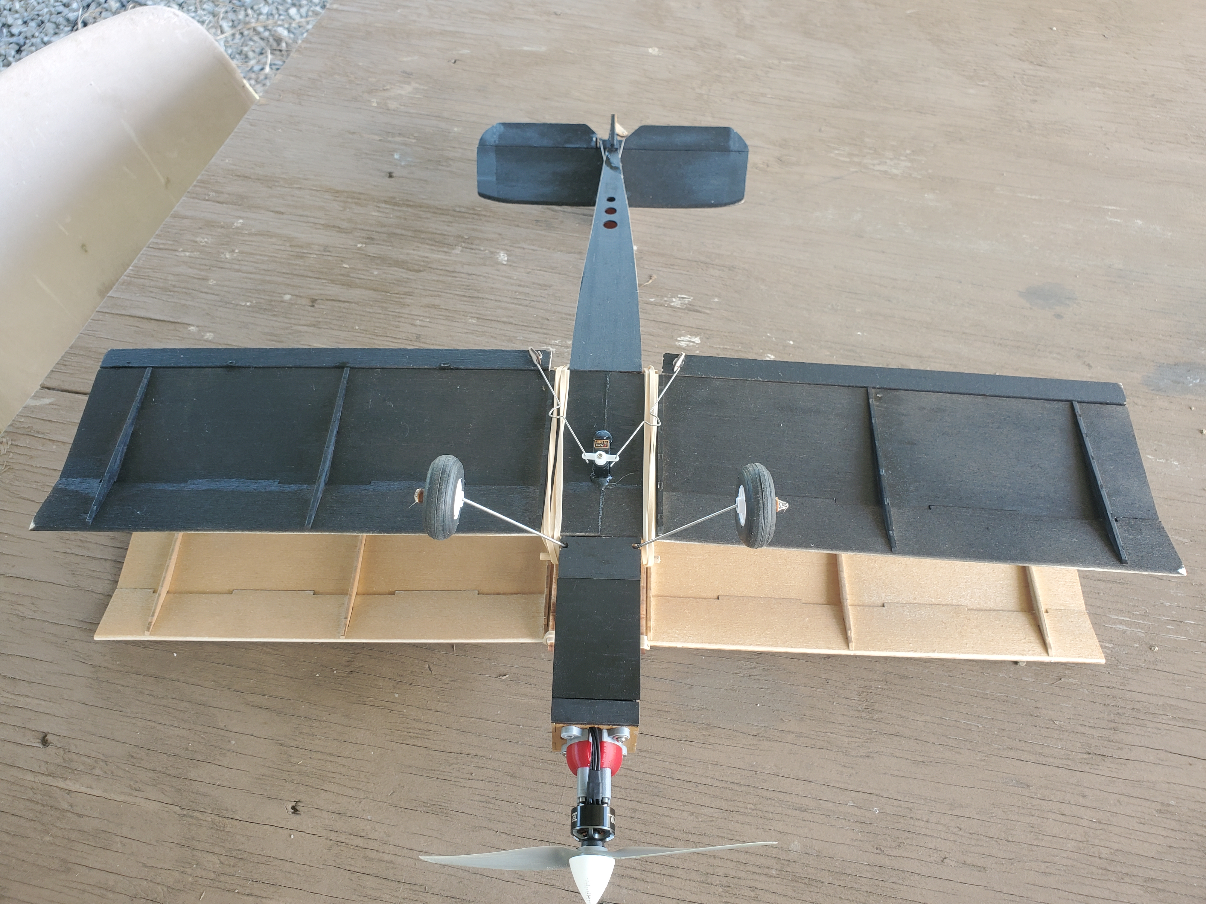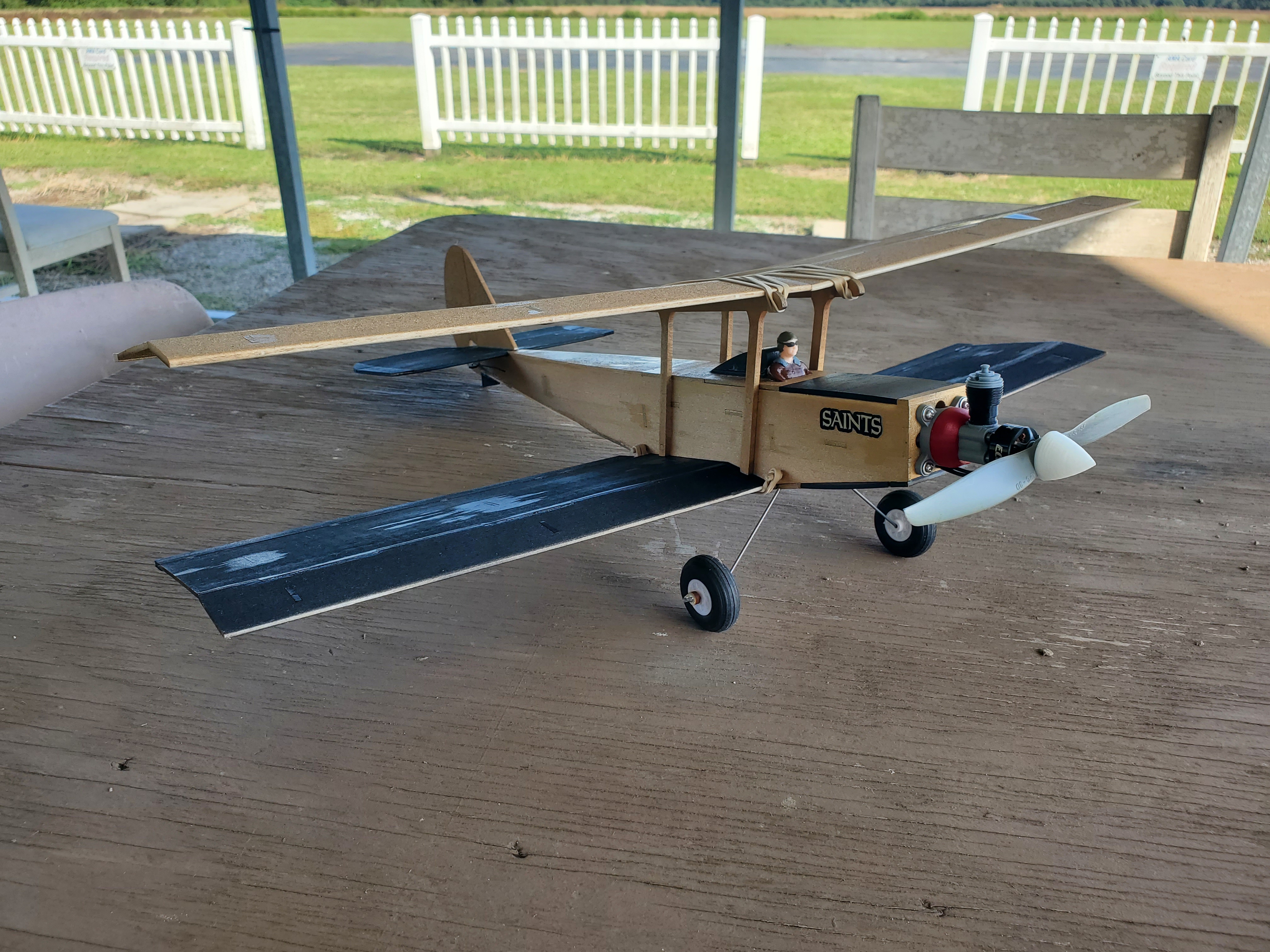 Not having sufficient confidence in my skill to do integral ailerons like Ed Larsen did, I opted for the easier route - full length trailing edge ailerons. I put fixed trailing edges on the upper wing to match. Per Ed's experience, I added some area to the horizontal stab and kind of wish I hadn't. Like my earlier experiment with the Littlest Stik Bipe project, I find it to be VERY pitch sensitive. Not as much as the Frankenstik but still overly so. Hopefully a bit more expo and/or travel limits will solve that. As with the FrankenStik, I went with a black and gold New Orleans Saints color scheme. Testors rattle can paint and MinWax WBPU top coat. EMax 1407 motor, 12A ESC, APC 6x3.1SF prop and 2s/500mah power.