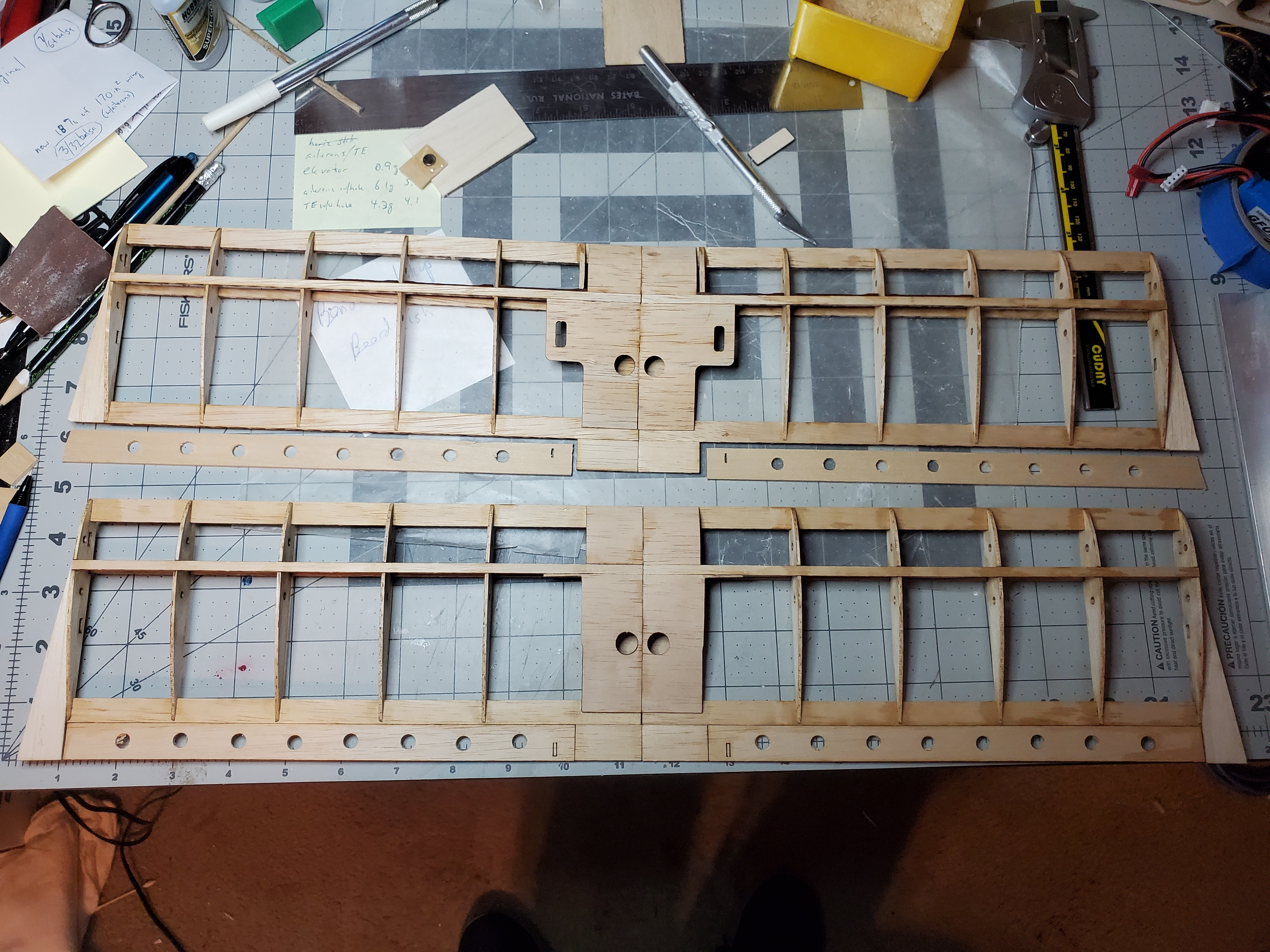 Back to the wings. Only slight additional mods. For both, I drilled 1/4 inch "lightening" holes in the ailerons/trailing edges using a Forstner bit in a drill press to get a clean cut in the soft balsa. For the upper wing, the ailerons are glued into place as a fixed trailing edge. I also trimmed the unnecessary part of the upper decking - total savings = about 1g