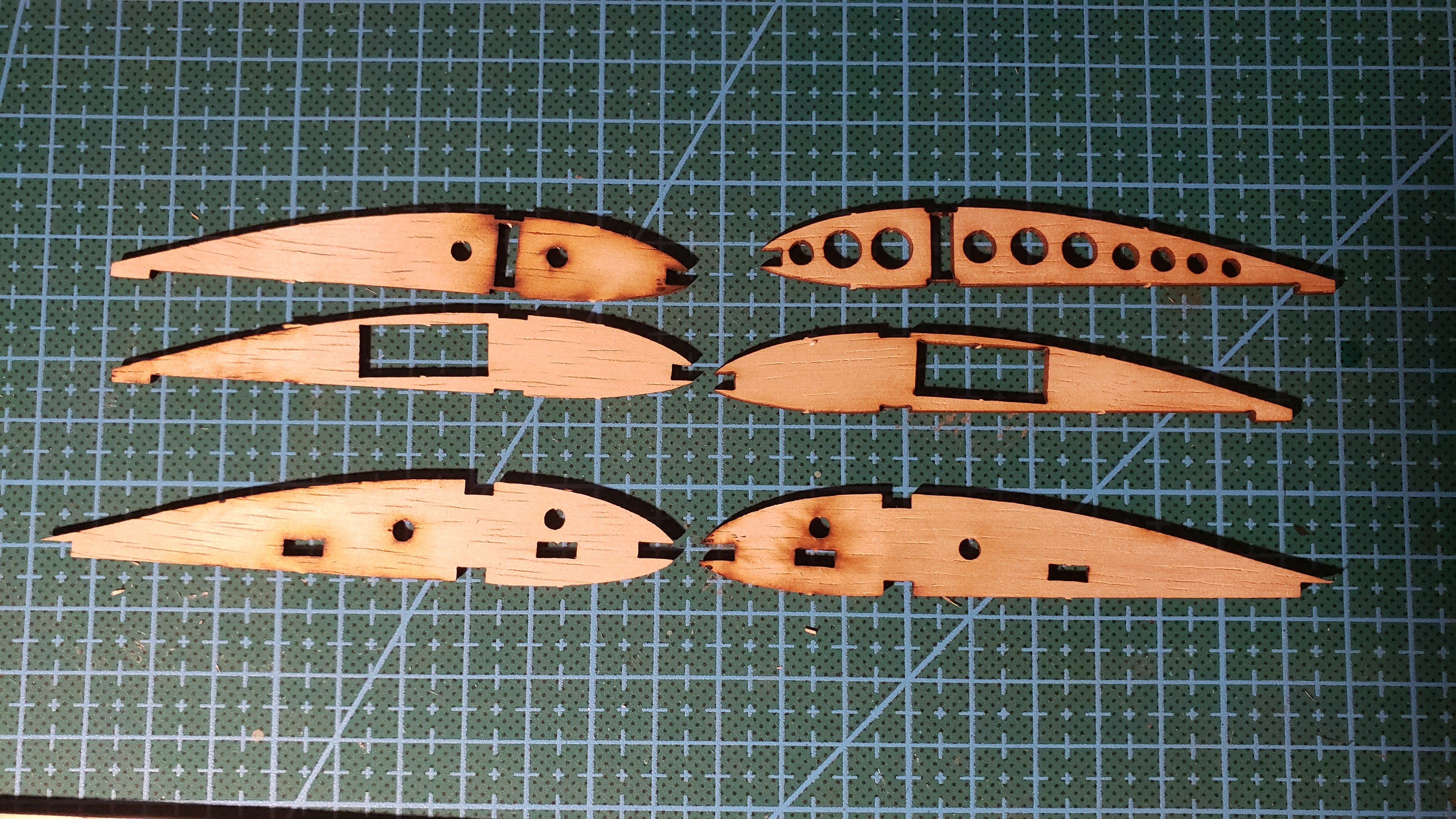 Top right and left are your very center ribs. the left one has extra holes to facilitate glueing the wing halves together.