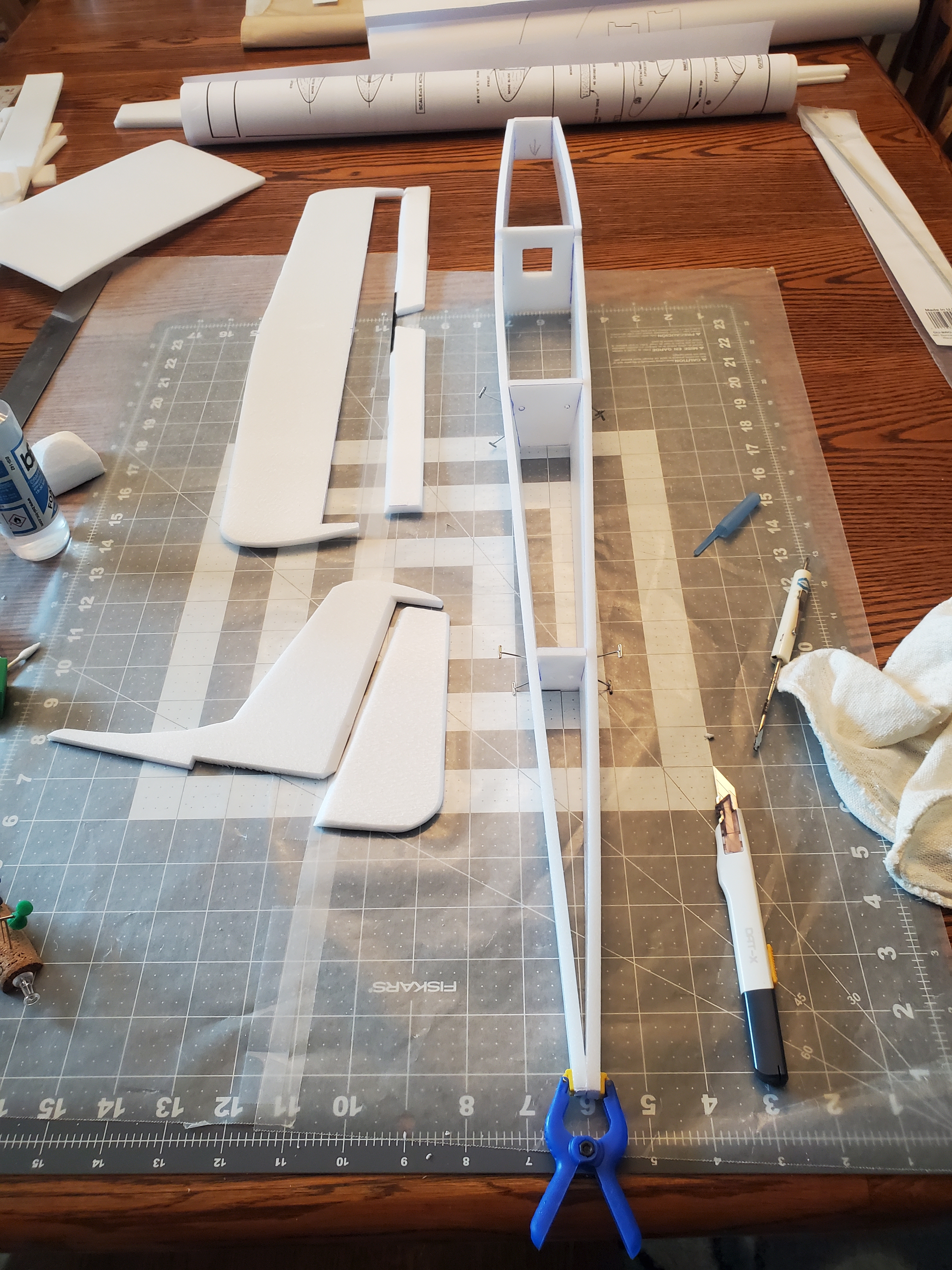 Tail feathers cut and shaped. Fuselage shaping up nicely.