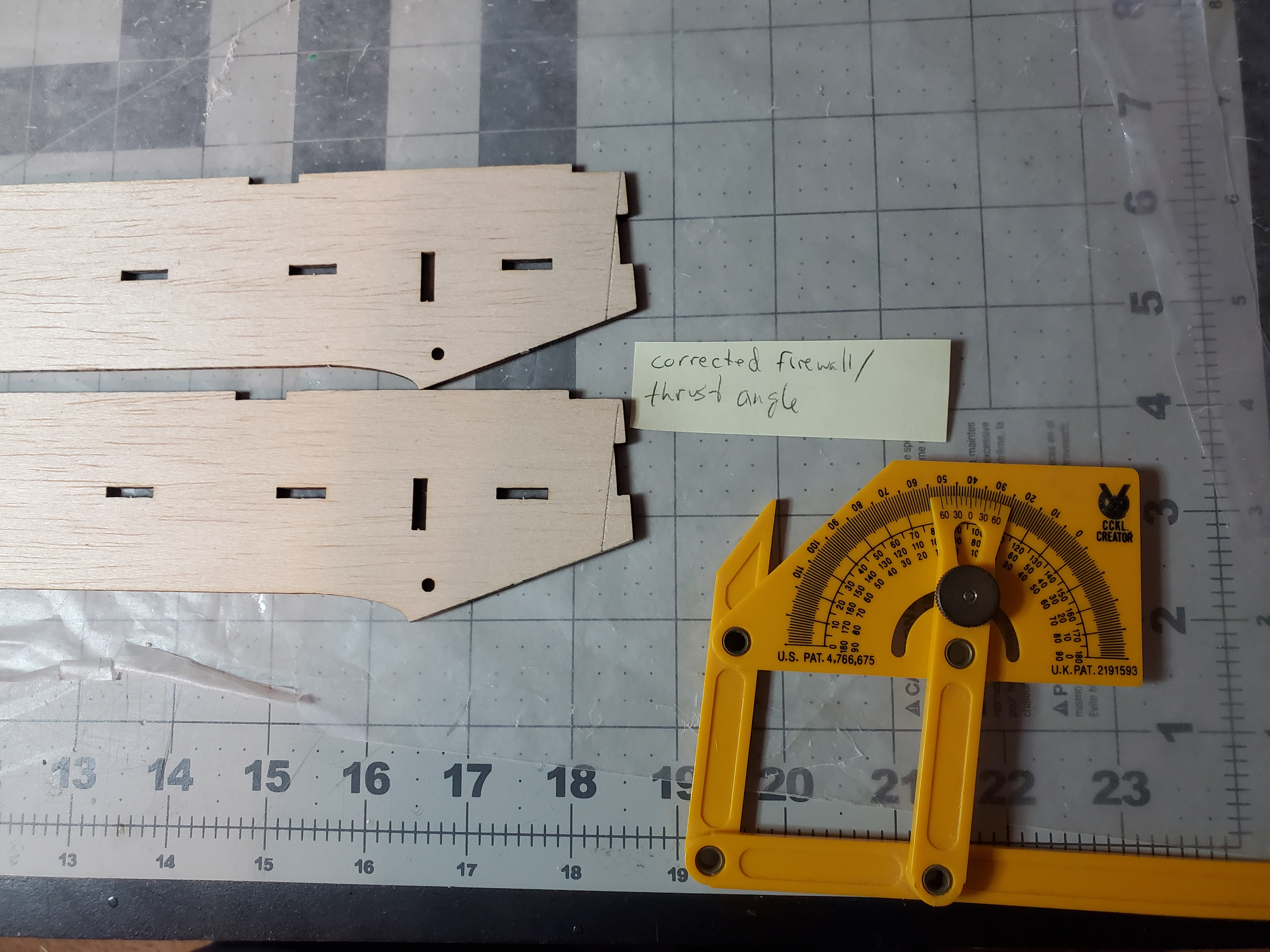 The first photo shows the unaltered side panels with notes indicating what must happen to them. The second photo shows the angular difference. The thrust angle mod completed. Next: re-engineering the wing saddle for what is now the LOWER wing.