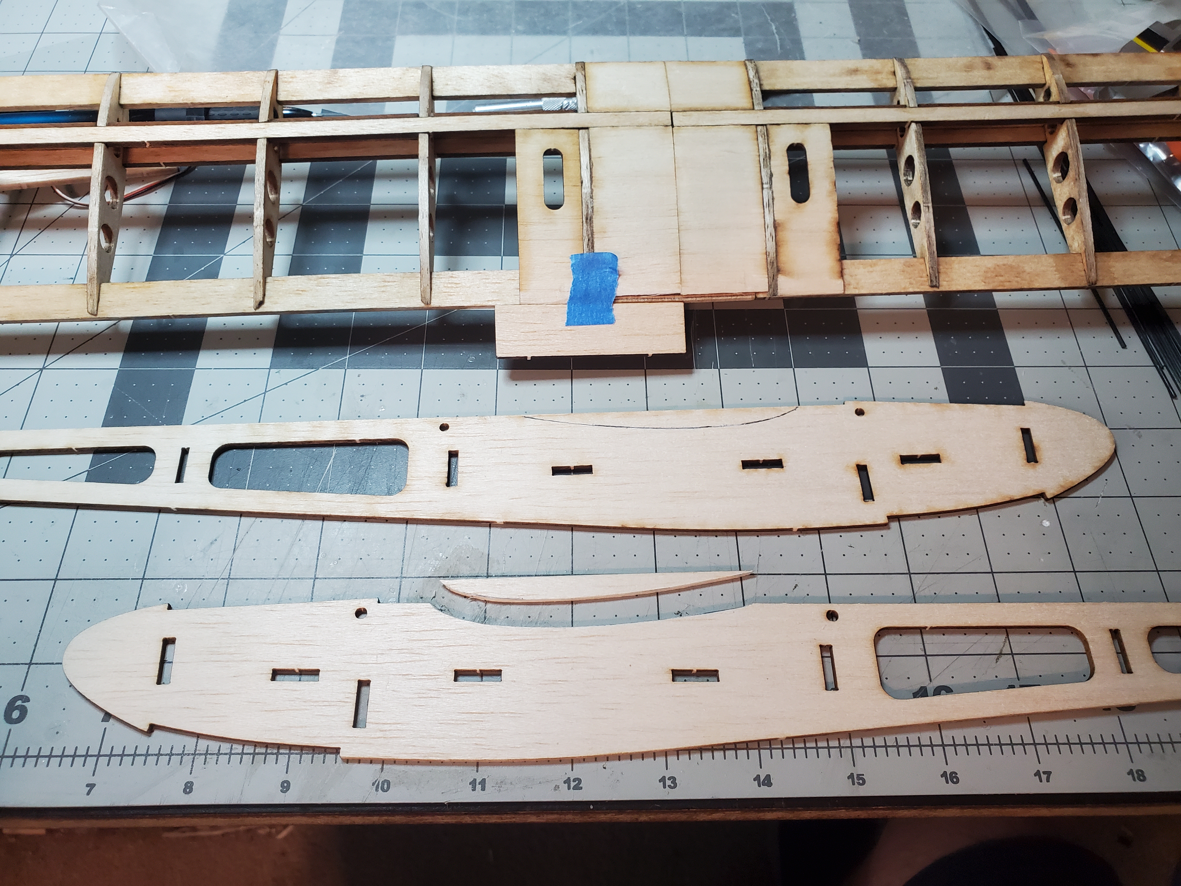 Now to the fuselage modification. The Hummer wing has significantly less chord than the stock flat bottomed S-Tee wing. Doug said S-Tees tend to be tail heavy anyway so I should mount the Hummer wing at the BACK of the S-Tee wing saddle to help with balance. Therefore, here are my fuse mods for the symmetrical wing.