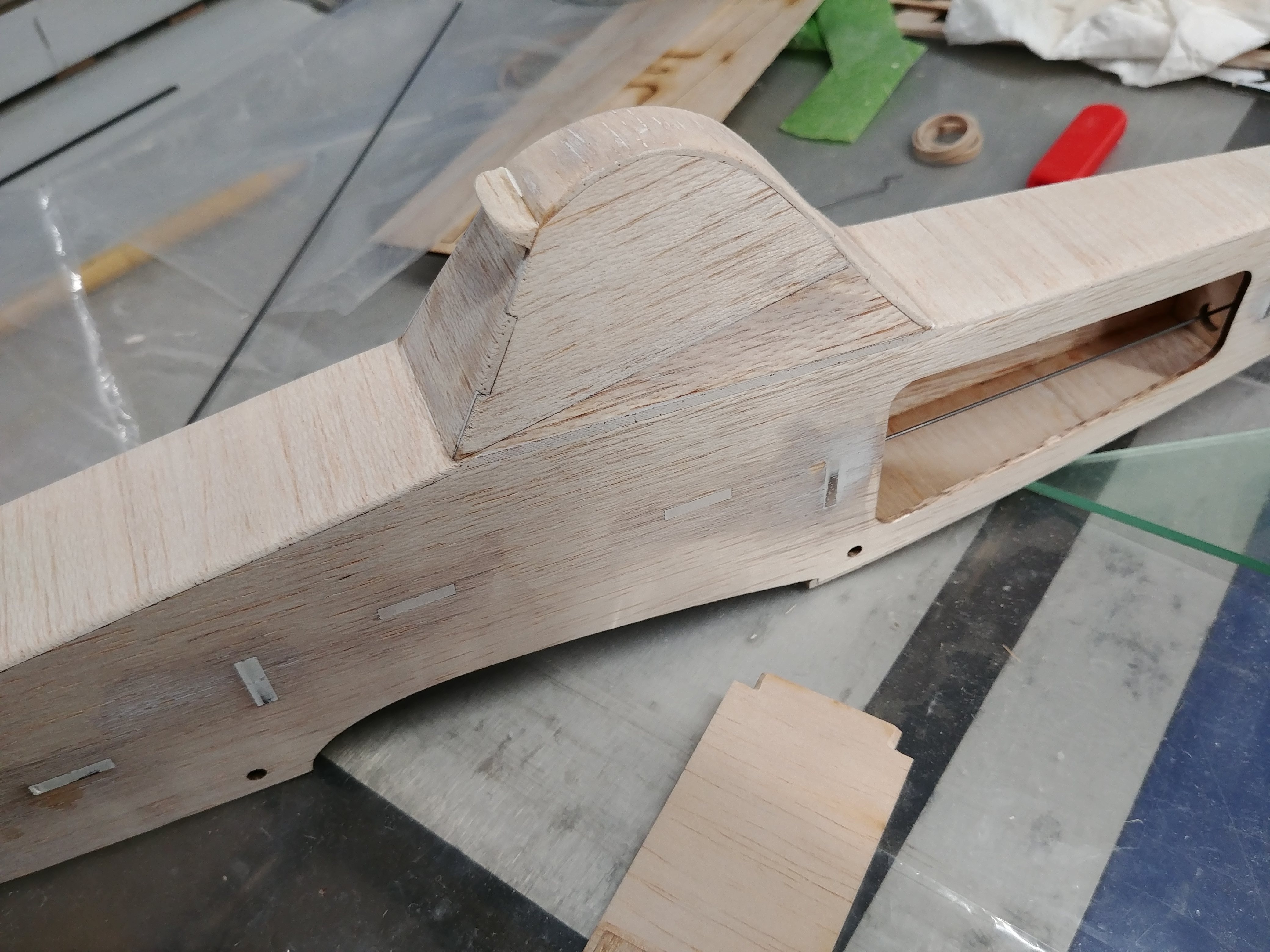 Before I glue in the last former in the tail I pinch the fuselage halves together and tape them. Then measure the fuselage width and hold the fuselage against a straight edge and make sure the seam at the tail is centered.